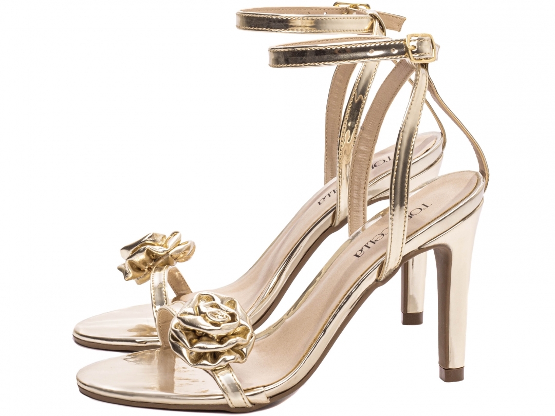 Palmilha: 8 mm de Espessura, Espuma em EVA, Revestida em Metalizado Speechio Ouro Light e Taloneira Napa Bege;
