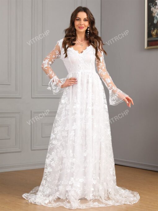 Conheça o nosso elegante Vestido de Noiva Dress Well! Este deslumbrante vestido apresenta um decote em V, bordado floral delicado e uma manga longa esvoaçante que adiciona um toque romântico ao visual. Feito de 95% poliéster e 5% elastano, este vestido é confortável e se ajusta perfeitamente ao corpo, destacando suas curvas de forma elegante.
