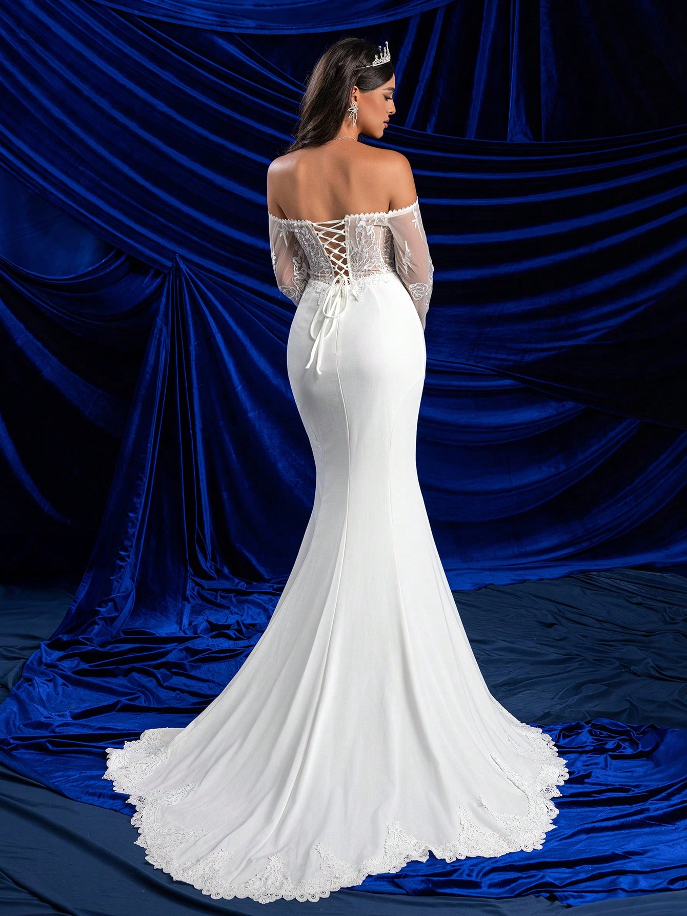 Vestido De Noiva Ombros de Fora, Manga Longa Transparente, Suporte de Busto, Costas Abertas com Renda, Bainha de Renda de Sereia